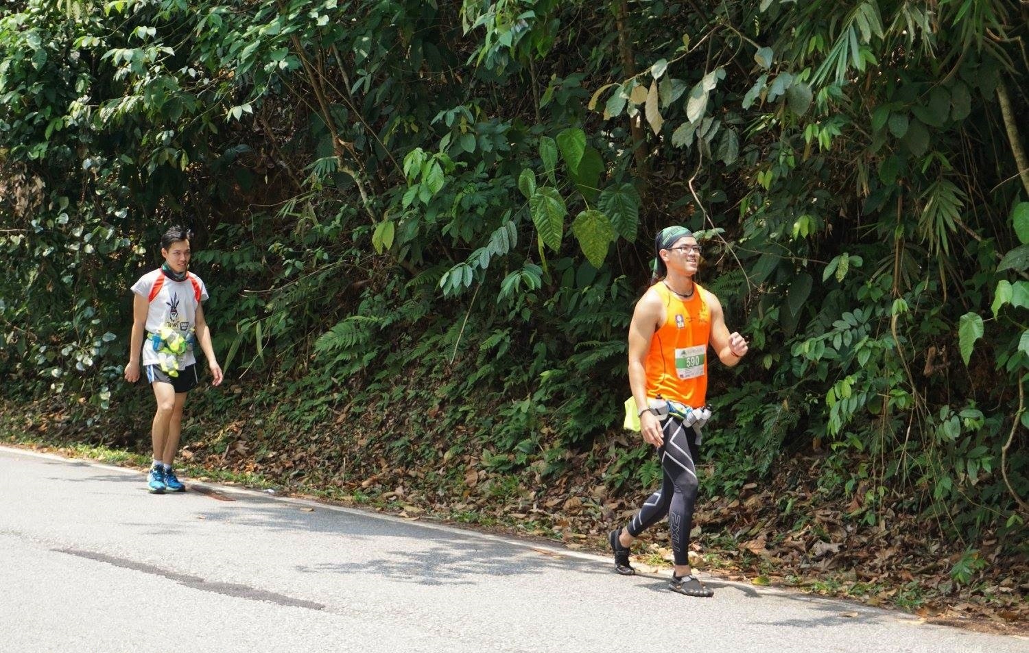 From here, the 50 km category runners are to make an U-turn back to the finishing point. There were Nasi Lemak served at the checkpoint. After having a quick meal and got my water bottle filled, the journey crawling back to uphill route began. I started to feel the tight pain caused by muscles on the back of both lower legs. It was not until 35 km distance where I rejoined with NKY, who was struggling to walk due to the killing pain of his right knee. We realized that we had to live with them and made it to the end.
